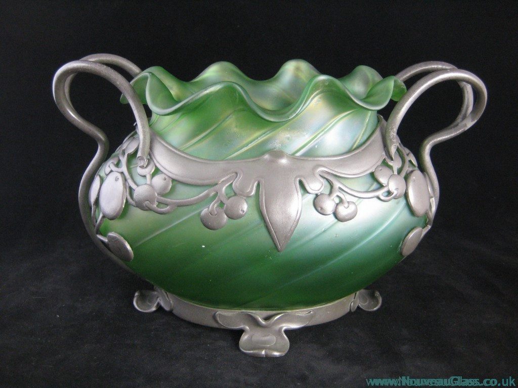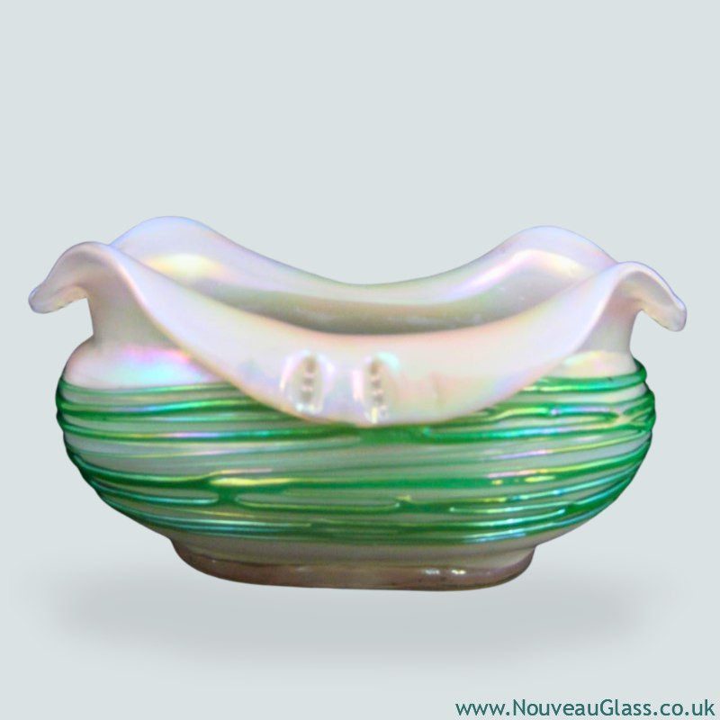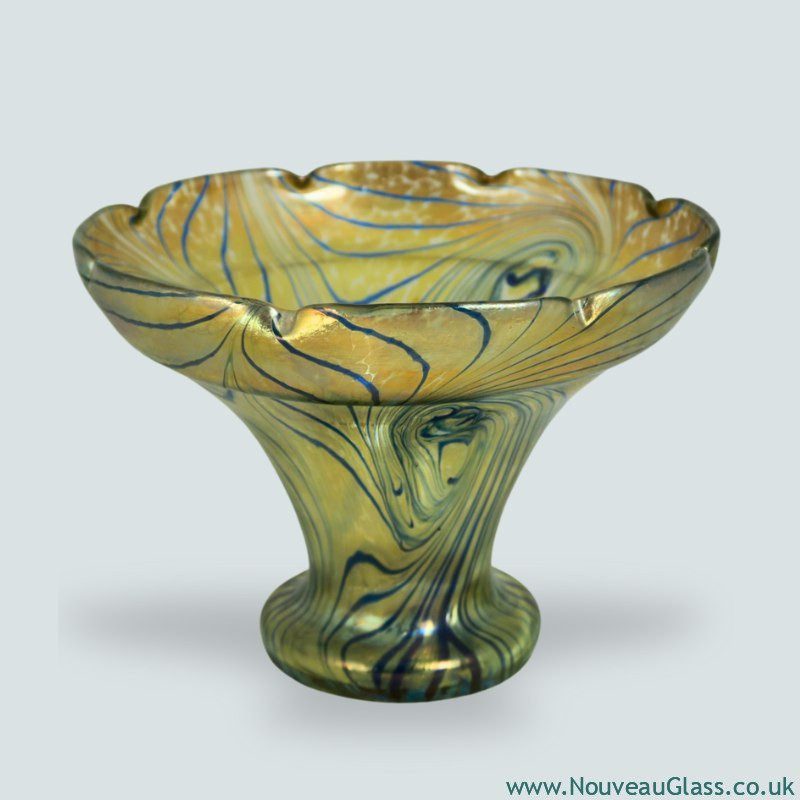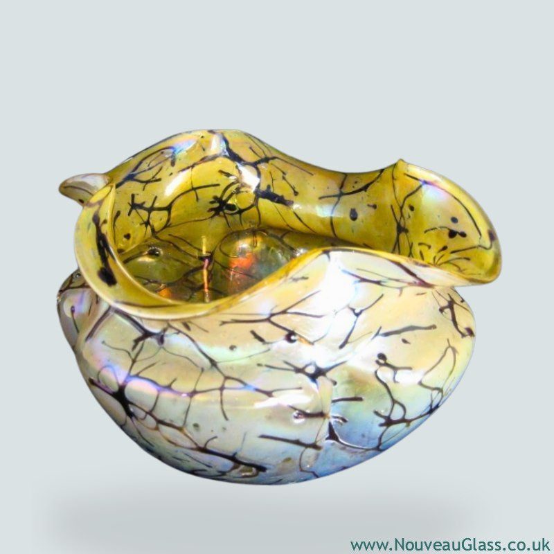Bohemian glass famed for web-like trailed designs, rich colors, and distinctive Art Nouveau artistry.